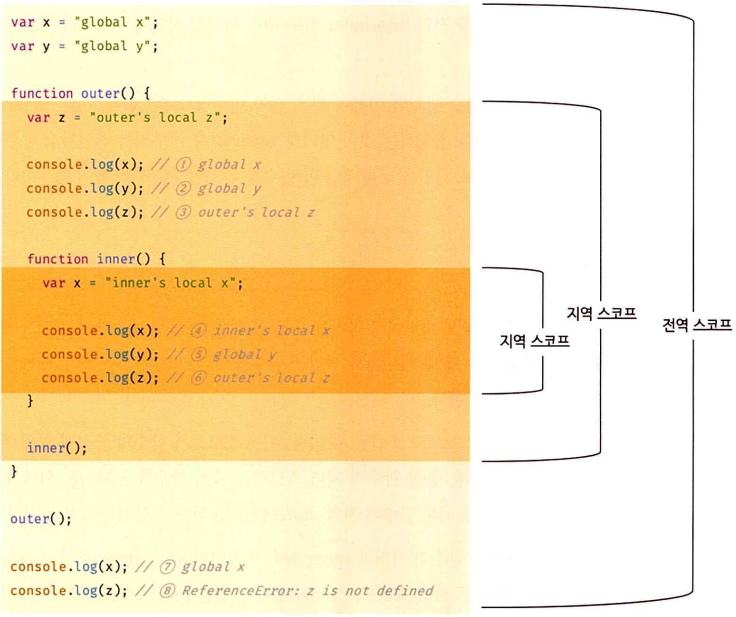 - 자바스크립트 엔진은 ‘스코프’를 통해 어떤 변수를 참조할 것인지 결정함 ⇒ ‘스코프’는 자바스크립트 엔진이 식별자를 검색할 때 사용하는 규칙이라고 할 수 있음