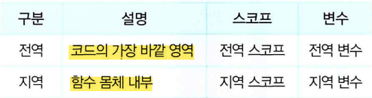 - 변수는 자신이 선언된 위치(전역 또는 지역)에 의해 자신이 유효한 범위인 스코프가 결정됨