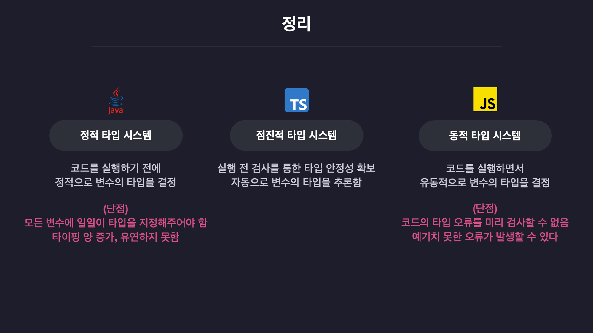 - 정적 타입 시스템 (코드 실행 전 모든 변수의 타입을 고정적으로 결정) - C, Java