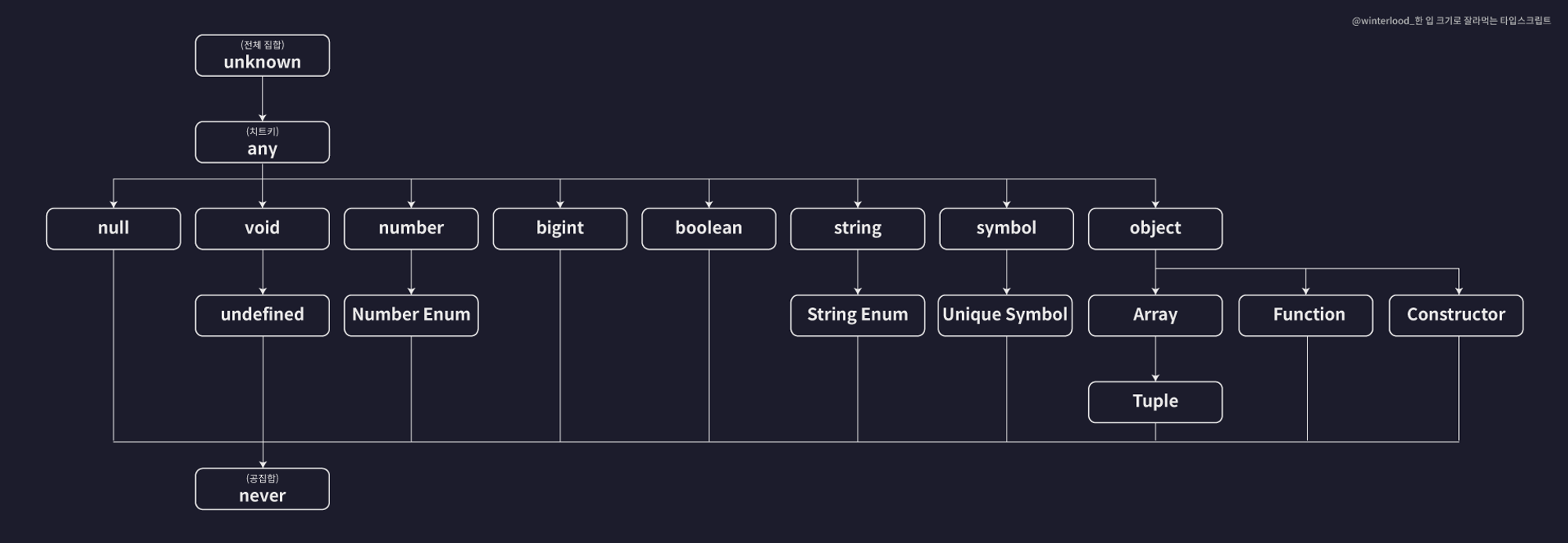 - 모든 타입스크립트의 문법과 규칙으로부터 자유롭지만, 그만큼 위험한 타입
